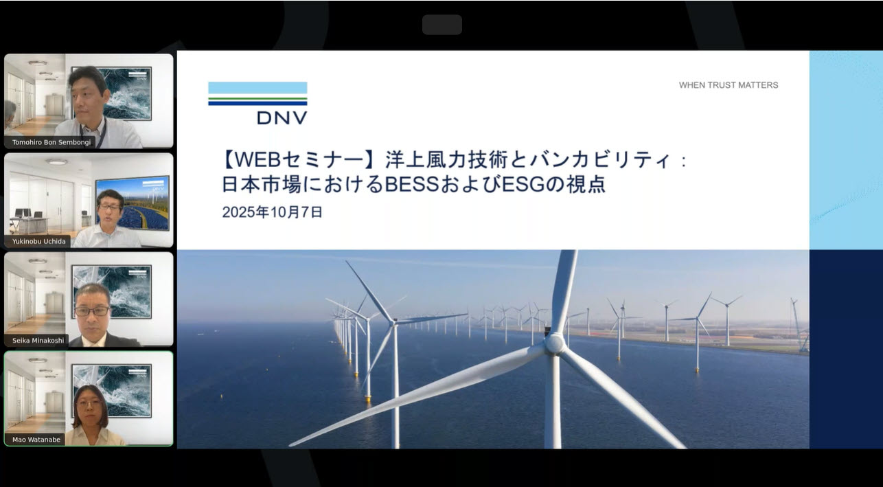 EnergyWebinar2025年 10月 07日 洋上風力技術とバンカビリティ:日本市場におけるBESSおよびESGの視点DNVの専門家が登壇する本WEBセミナーでは、日本の洋上風力・蓄電セクターを形成する最新の重要技術および戦略動向を、事業者、金融機関、ステークホルダー の皆様向けにわかりやすく解説します。今すぐ視聴する