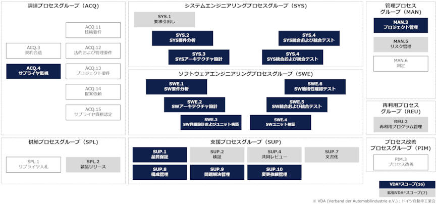 また、多くの取引先が要求する16プロセスで構成されているVDAスコープというものがあり、調達プロセスグループからACQ.4、エンジニアリングプロセスグループからSYS.2,3,4,5, SWE.1,2,3,4,5,6、管理プロセスグループからMAN.3、支援プロセスグループからSUP.1,8,9,10が選定されています。