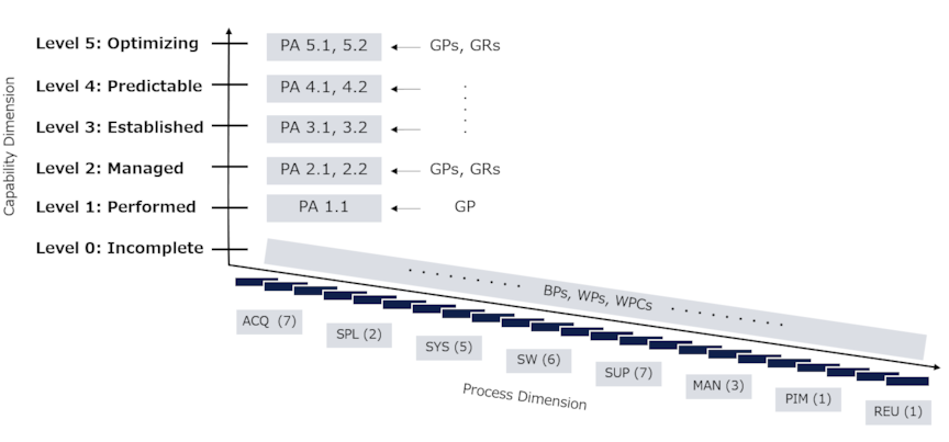 その能力レベルを測定するために、プロセス属性が定義され、プロセス属性の達成を評価するためにプロセスの実施指標(能力レベル1の評価に使用される各プロセスにおける基本プラクティスと作業成果物)と、プロセスの能力指標(能力レベル2~5の評価に使用される共通プラクティスと共通リソース)が定義されています。
